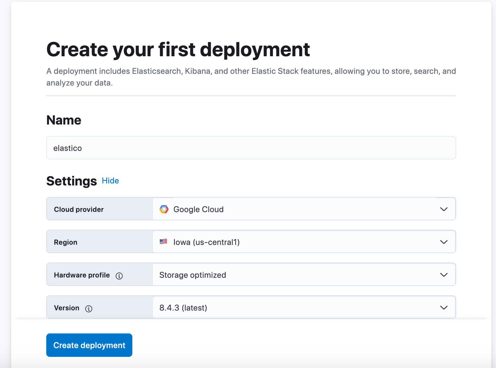 Create a deployment by providing a deployment name e.g. elastico and using the default values for the cloud provider, region, hardware profile and version as shown below
