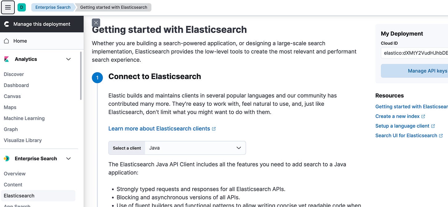 Toggle the sidebar, under Enterprise search, click on Elastic Search