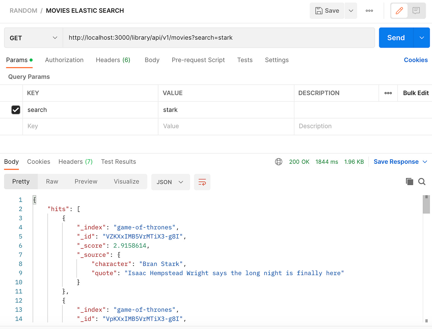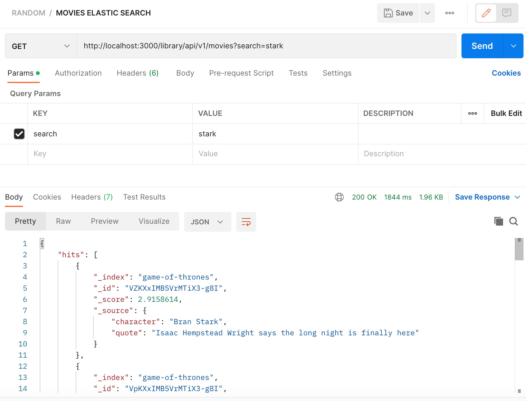 Once your server is started, make a request to the localhost:3000/library/api/v1/movies?search=stark endpoint, you should be able get a response like in the image below